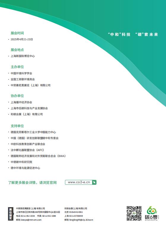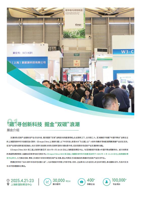 为更好的促进碳中和相关技术发展,在相关行业权威机构的共同支持下,2025第3届上海国际碳中和科技博览会(简称上海碳科展COexpochina2025)在上海新国际博览中心举办,展会以“中和”科技‘碳’索未来为主题,聚焦碳捕集、利用、封存,节能低碳技术,氢能与循环利用等相关的净零碳技术。