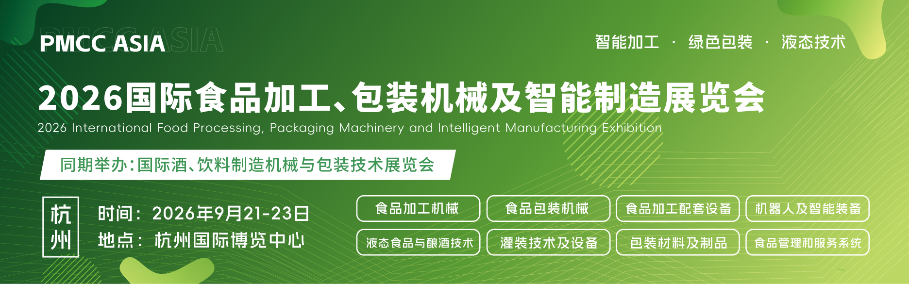 在食品工业迈向智能化、绿色化、液态技术革新的关键节点,由上海百贸展览有限公司倾力打造的 “PMCC ASIA 2026国际食品加工、包装机械及智能制造展览会暨国际酒、饮料制造机械与包装技术展览会” 将于2026年9月21-23日在杭州国际博览中心盛大开幕,并于2027年3月9-11日移师济南黄河国际会展中心续写精彩。
