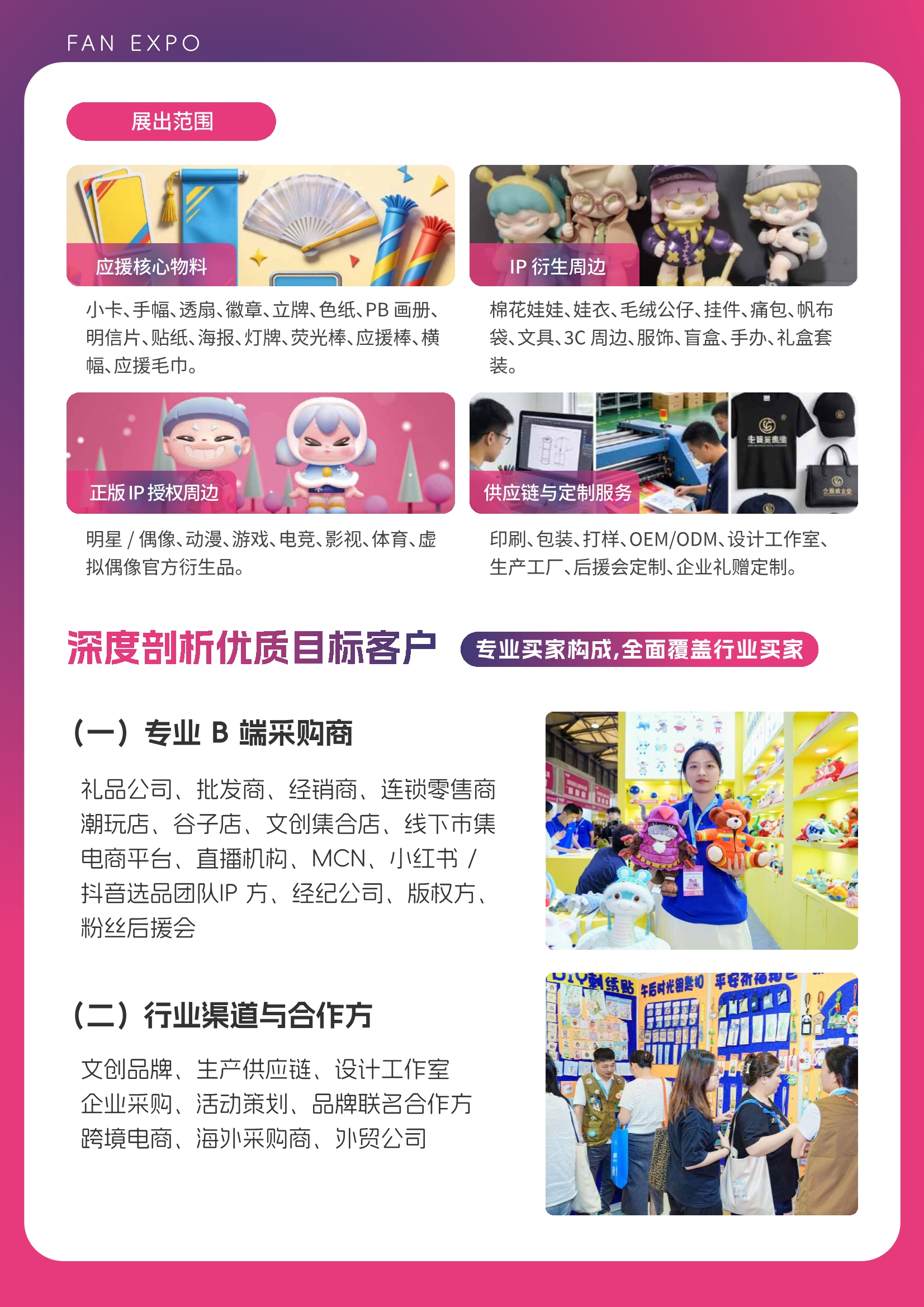 展会整合应援周边全产业链优质资源,覆盖核心应援物料、IP衍生周边、正版授权衍生品及定制供应链服务,打破行业信息壁垒、对接瓶颈与版权难题,为企业提供高效对接、精准获客、品牌升级、渠道拓展的一站式参展体验,助力企业抢占粉丝经济万亿新赛道,共筑应援文创产业新高地。