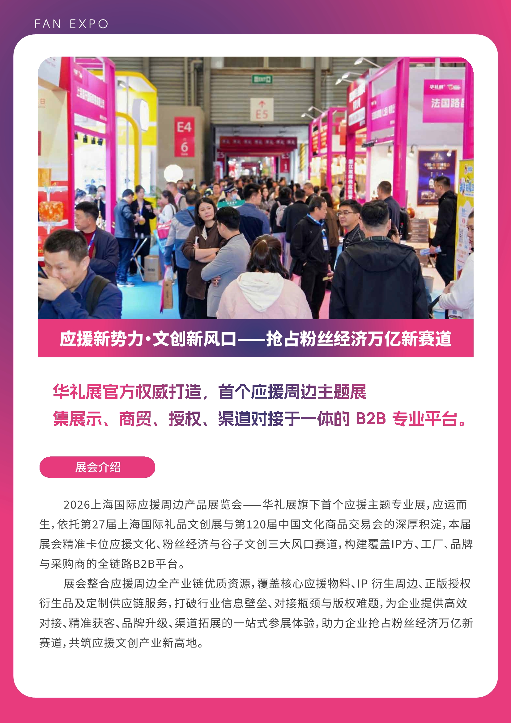 上海海国际应援周边产品展览会⸺华礼展旗下首个应援主题专业展,应运而生,依托第27届上海国际礼品文创展与中国文化商品交易会的深厚积淀,本届展会精准卡位应援文化、粉丝经济与谷子文创三大风口赛道,构建覆盖IP方、工厂、品牌与采购商的全链路B2B平台。